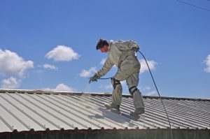 A,Tradesman,Uses,An,Airless,Spray,To,Paint,The,Roof